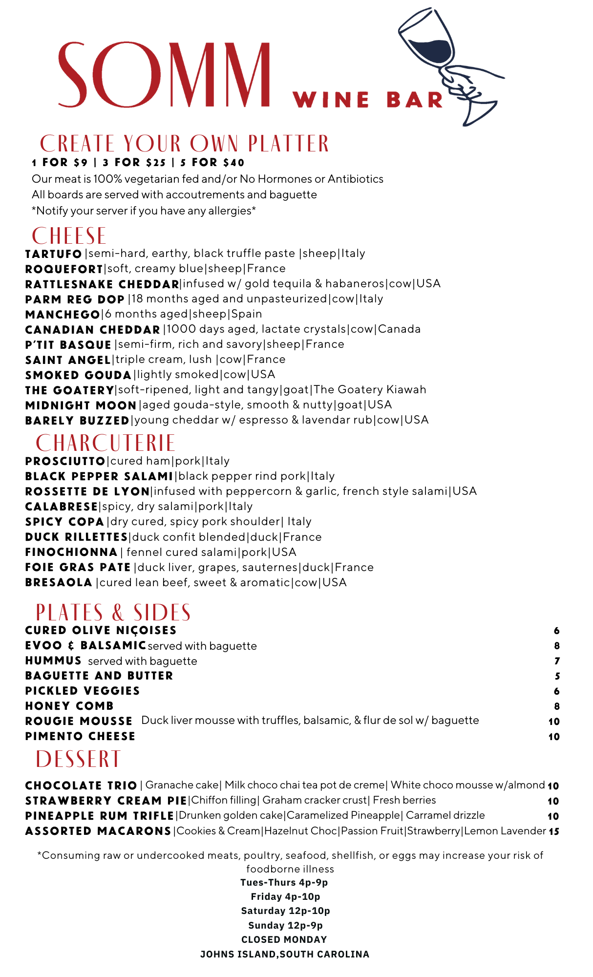 At Somm Wine Bar, we pride ourselves on offering a unique experience that sets us apart from other wine bars. What sets us apart is the ability for our customers to completely customize their own charcuterie boards. You have the freedom to choose between 1, 3, or 5 different kinds of high-quality cheese and/or meat.